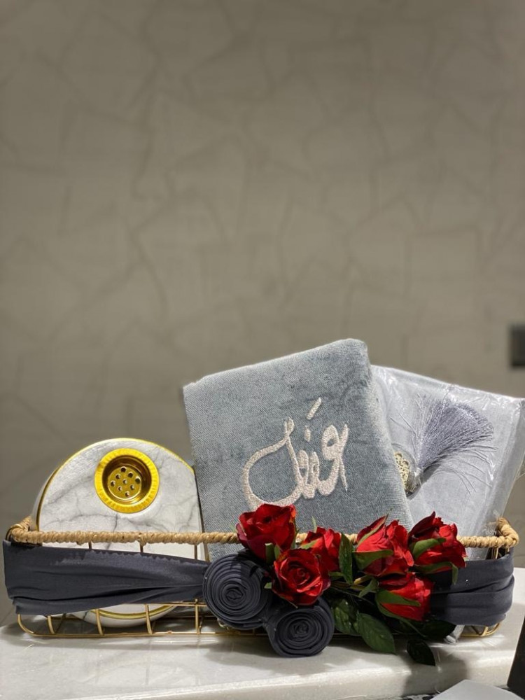 سلة مكونة من مصحف مطرز بالأسم وشرشف صلاة ومبخرة